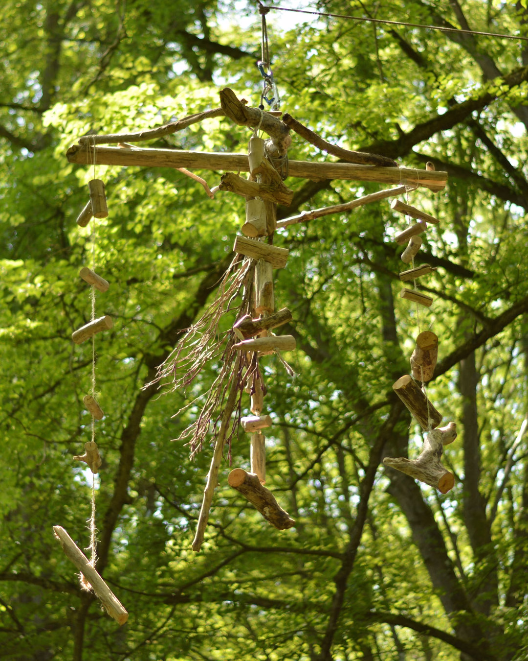 Die Materialität dieses Ensembles ist eine Lektion in gelebter Zeit. Tomek assembliert Treibholz – jene vom Wasser geschundenen, glattpolierten Knochen der Flora –, die eine Reise hinter sich haben, von der die umstehenden Buchen nur träumen können. Die Oberflächen changieren zwischen einem morbiden Elfenbeinweiß und silbrigem Grau, haptische Zeugnisse einer jahrelangen Erosion. Der Künstler nutzt diese verwitterten Töne als Gegenspieler zum omnipräsenten Smaragdgrün des Waldes. Während das Laub die Vergänglichkeit des Jahreszyklus feiert, repräsentiert das Treibholz die Ewigkeit der Entbehrung. Besonders brillant ist der minimale, fast chirurgische Einsatz von Zivilisationsspuren: Ein silberner Metallkarabiner bildet den Scheitelpunkt der Konstruktion. Dieser kühle, industrielle Fremdkörper fungiert als Gelenk zwischen menschlichem Gestaltungswillen und der rohen Schwerkraft. Die Aufhängung an faserigen Juteschnüren in neutralem Beige mimikriert die Ranken der Umgebung, doch die Komposition selbst – eine horizontale Hauptstange, von der vertikale Linien herabregnen – erzwingt eine geometrische Strenge, die der Natur fremd ist. Das diffuse Licht, das durch das Blätterdach bricht, erzeugt ein Chiaroscuro, das die rissigen Borkenreste und polierten Fasern nicht bloß beleuchtet, sondern sie als archaische Relikte inszeniert.