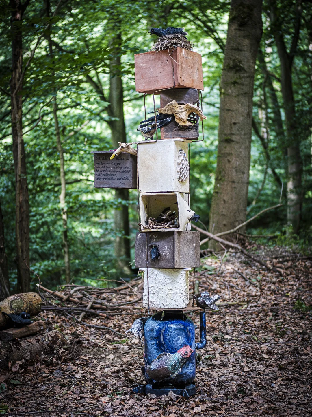 Die neunteilige Keramik- und Stahlskulptur präsentiert sich als kraftvolle visuelle Aussage. Während der Waldboden in sanften Moosgrüntönen und organischem Chaos atmet, erhebt sich dieser Turm in bewusster Gegensätzlichkeit. Die terracottaroten und graugebeigten Keramikblöcke, gestützt von einem filigranen Metallgerüst, bilden eine architektonische Präsenz, die nicht verstecken will, sondern sich deutlich zeigt. Das leuchtende Kobaltblau des Sockels setzt einen mutigen Akzent – ein künstlerischer Fingerzeig, dass die Künstlerin hier bewusst eine Spannung schafft. Diese Spannung ist nicht störend, sondern bereichernd: Sie macht sichtbar, was unsichtbar ist – nämlich die Grenzen und Kategorien, in denen wir denken.